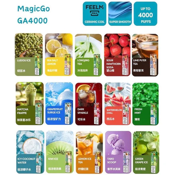 悦刻 RELX MagicGo 4000口是一款革命性创新的高端一次性电子烟,得益于 FEELM MAX™ 陶瓷线圈驱动技术,它提升了大约55%的气溶胶离子雾化度,极大地减少了口腔残留,真正做到了每一口吸食都细腻纯净。与普通网状雾化结构相比,它提供了更好的口味一致性和更顺畅的抽吸体验。悦刻 RELX MagicGo 4000口采用优质金属外壳设计,工艺卓越,线条流畅且充满了时尚感,其可视化油仓能随时监控烟油消耗量。盈盈一握,让您倍感尊贵,。1100mAh的无敌电池容量能够为该产品全程提供雾化能量,无须充电。高端的产品设计理念加持经典卓越的悦刻经典口味,是GA4000畅销不衰,供不应求的秘诀。它太耀眼了,是一次性电子烟市场上最璀璨的明星。